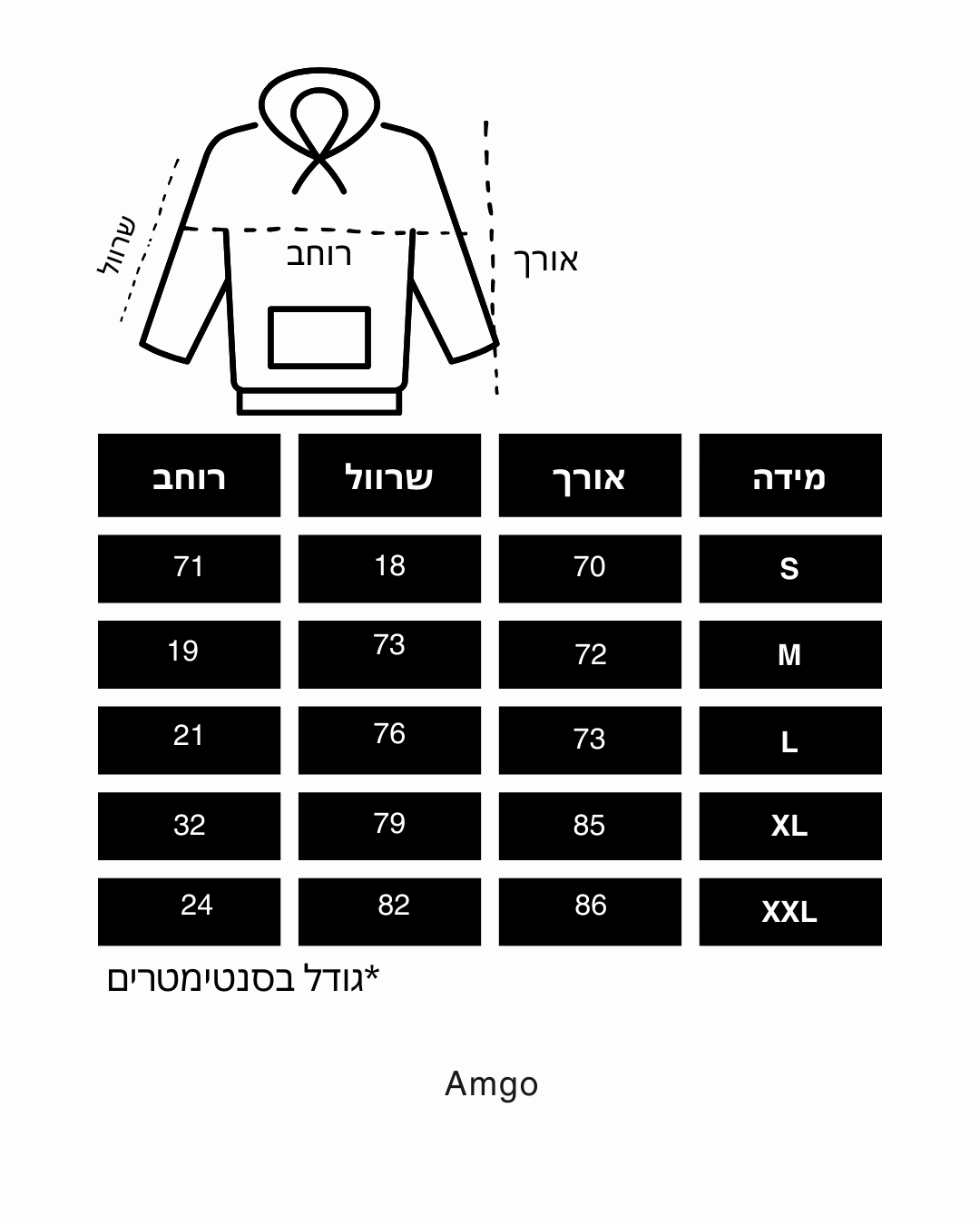 הקפוצ'ון מגיע בגזרת אוברסייז, והוא ארוך גם בידיים וגם בחלק התחתון, כך שבדרך-כלל אין צורך לעלות במידה. אחרי שאתה בוחר את המידה הרגילה שלך (או מידה אחת מעל), השתמש בטבלת המדדים בסנטימטר כדי לוודא התאמה מושלמת לפי רוחב החזה, אורך השרוול ואורך הקפוצ'ון.